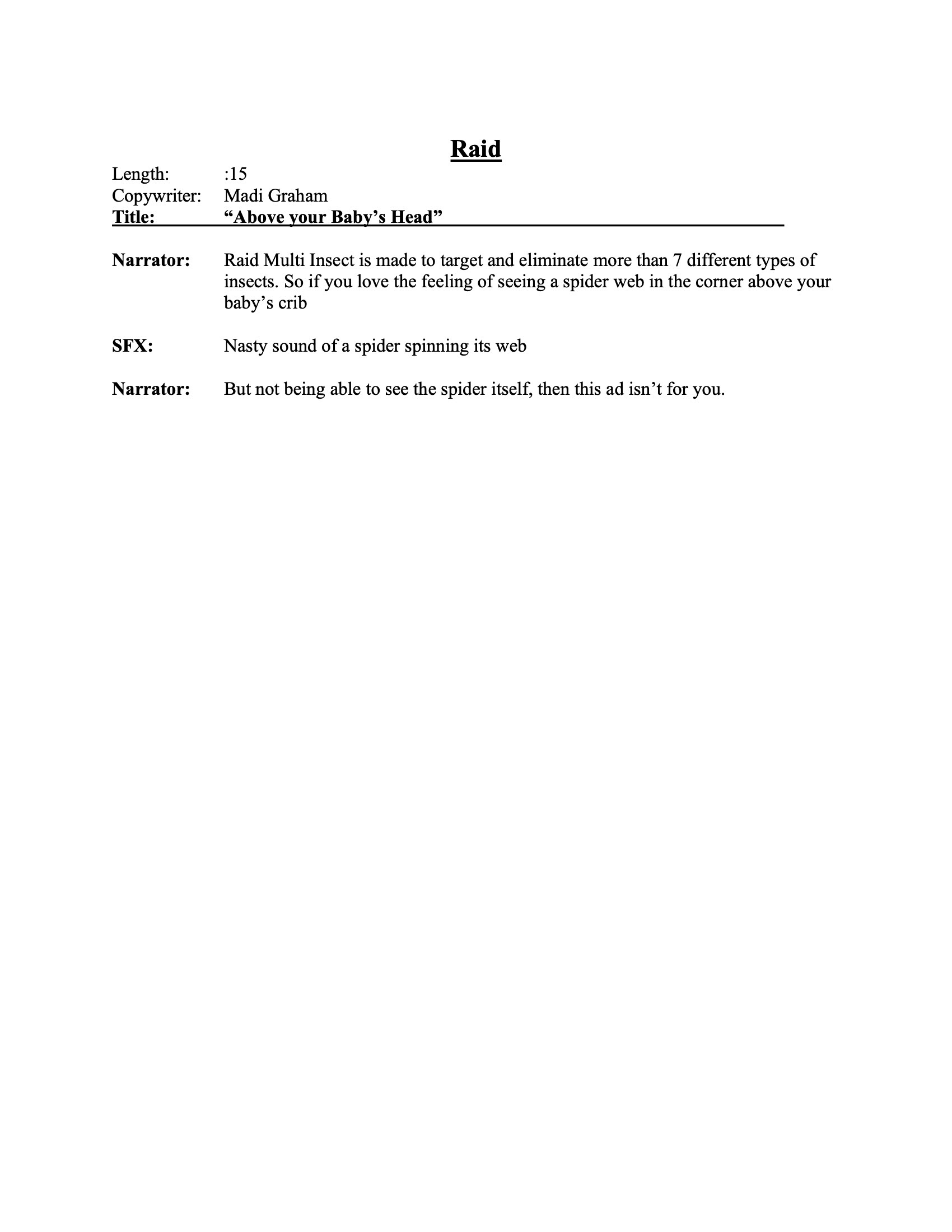 If insects don’t bother you, these ads aren’t for you. Each spot uses uncomfortable, vivid scenarios and sound design to confront listeners with the realities of living with bugs—then flips the message to position Raid as the obvious solution.